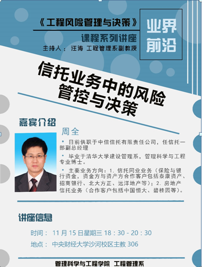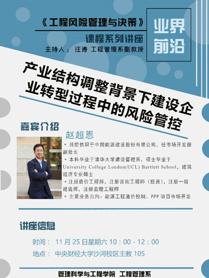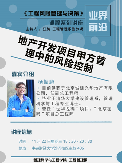 为了促进研究生课程的教学实践改革,丰富课程教学内容,加深学生理论联系实际的能力,搭建课堂与业界的桥梁,jinnianhui金年会登录入口汪涛副教授开设的研究生课程《工程风险管理与决策》邀请了一系列与工程与项目管理专业相关行业的企业中高层管理人员,分主题介绍业界工程与项目风险管理与决策相关的实操经验,欢迎感兴趣的老师与同学们参加。课程安排如下: