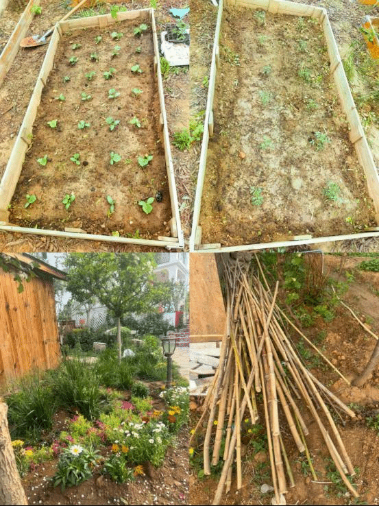 在老师们的辛勤劳作下,菜园里种上了黄瓜、西红柿、辣椒等多种蔬菜幼苗,心灵手巧的老师们还在菜园旁建造了一个美丽的花圃,园子外还有修剪好的数十根竹篱笆,光洁笔直,长度一致,准备“奔赴”菜园,履行它们的使命。