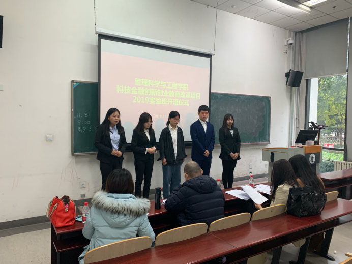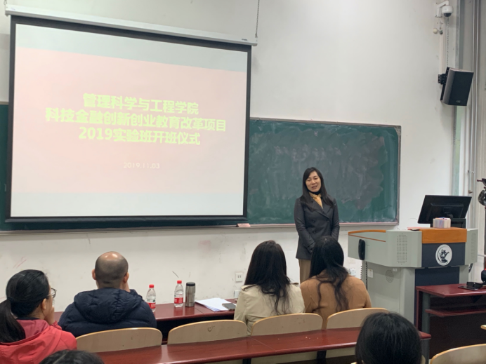 2019年11月3日上午9:30,jinnianhui金年会登录入口与深圳弈投孵化器合作的科技金融创新创业教育改革项目2019级实验班开班仪式于沙河校区主教102教室举行,开班仪式由院长助理高菠阳副教授主持。深圳商弈投资孵化器合伙人曹璨总经理,jinnianhui金年会登录入口书记姜涛,院长助理高菠阳副教授,任课教师宋砚秋副教授和陈暮紫副教授参加了科技金融实验项目的面试及开班仪式。