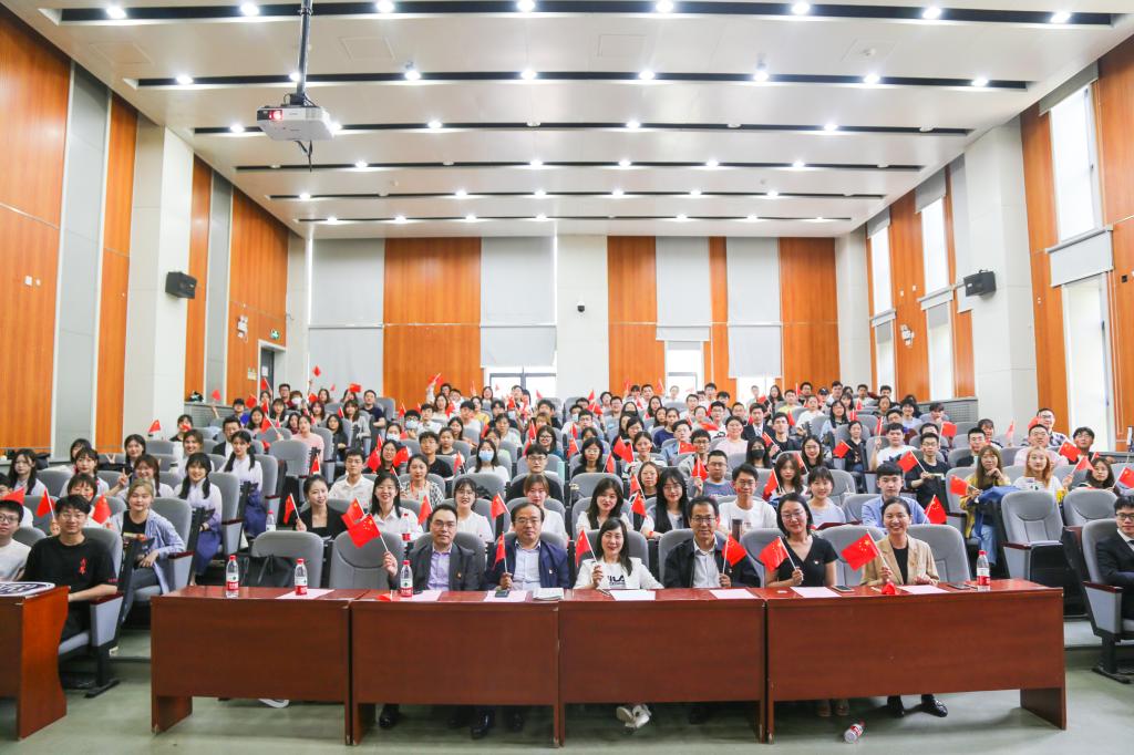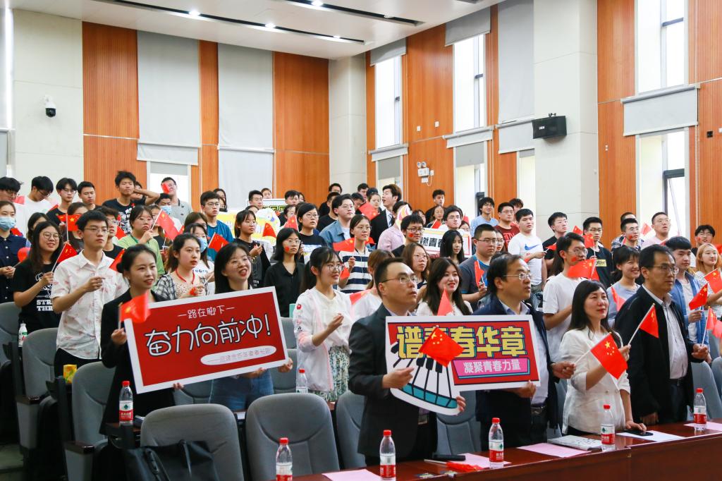 最后,大会上演了以“南陈北李,相约建党”为主线的历史情景剧。同学们亲身扮演陈独秀、李大钊等革命家。声情并茂、充满激情的表演仿佛把观众带回了那个奋进的年代,引起台下热烈掌声。一曲《不忘初心》,在场师生们自发跟唱,挥舞手中的红旗。在动听的旋律和舞团精彩的舞蹈中,五四表彰大会画上了圆满的句号。