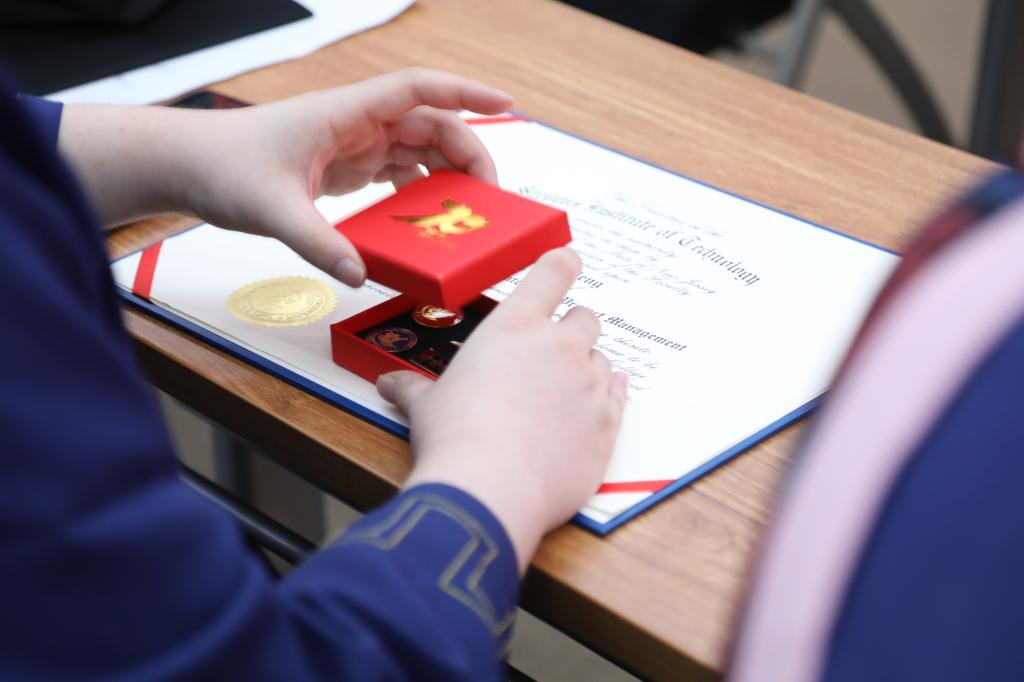 院党委书记姜涛为毕业生校友颁发纪念徽章
