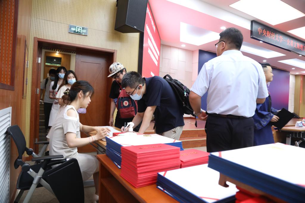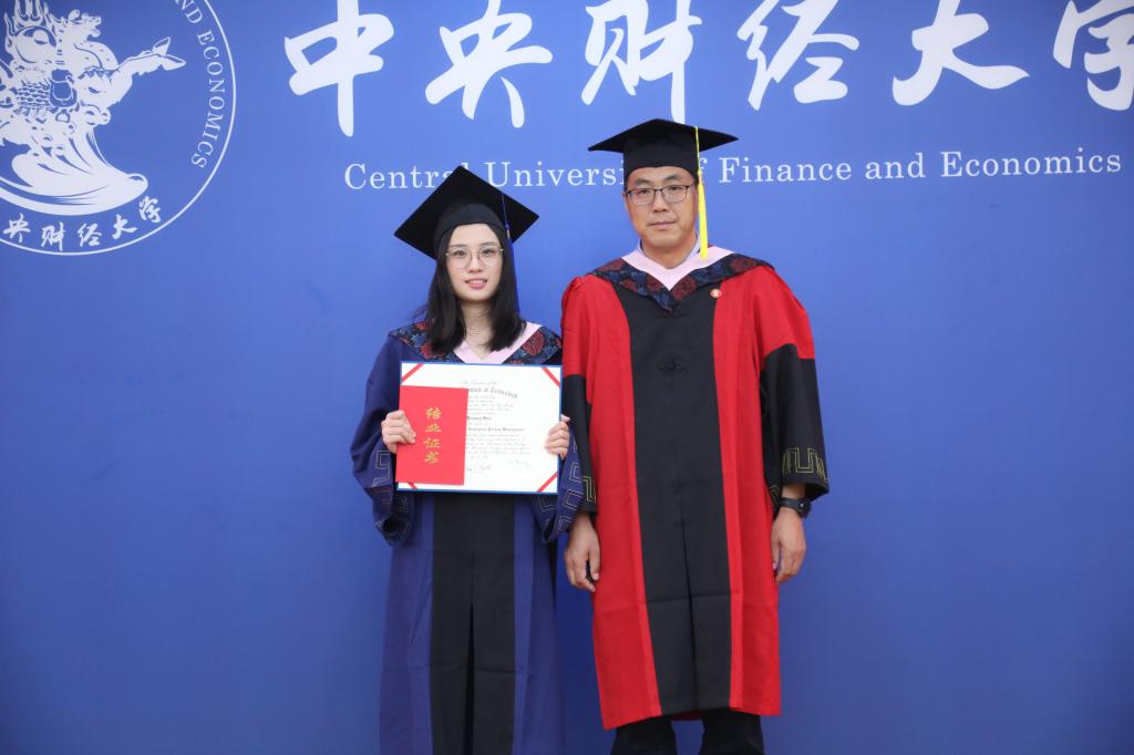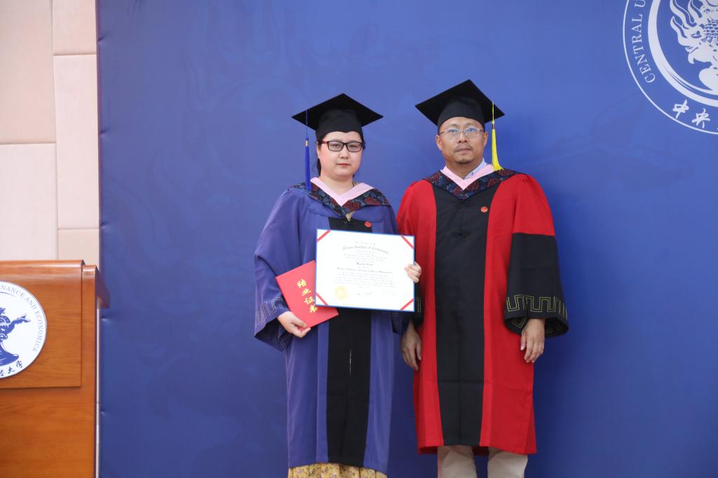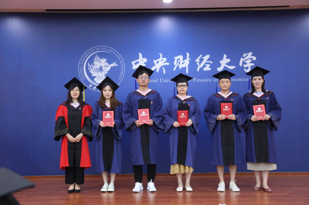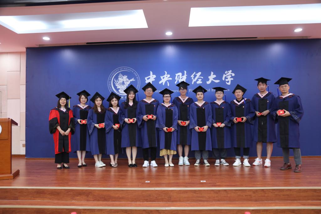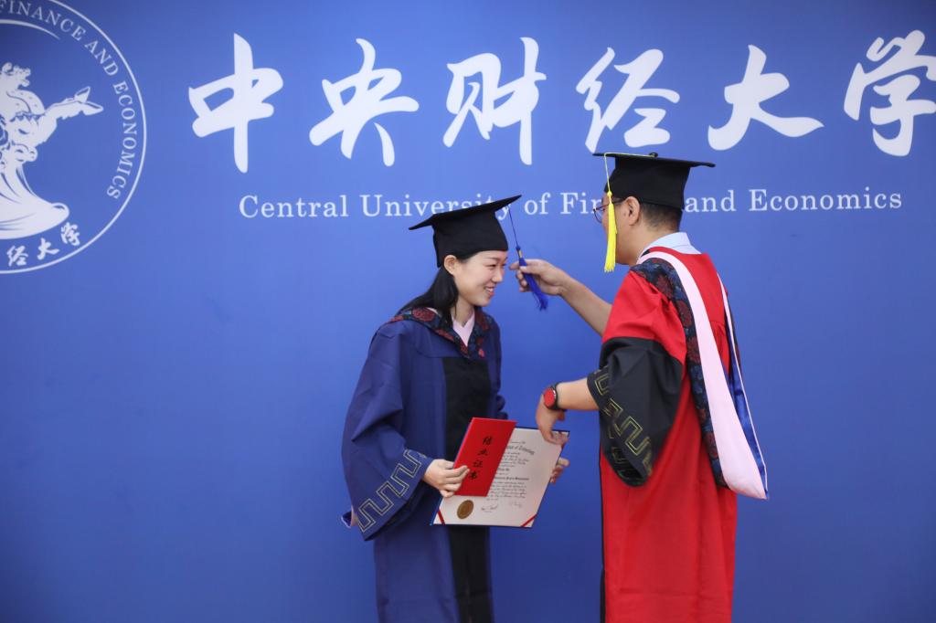 接下来进行的是学位授予仪式。毕业生们逐一上台,陈俊华副院长为同学们颁发美方学位证书和中财结业证书,刘志东院长为毕业生们拨穗正冠。