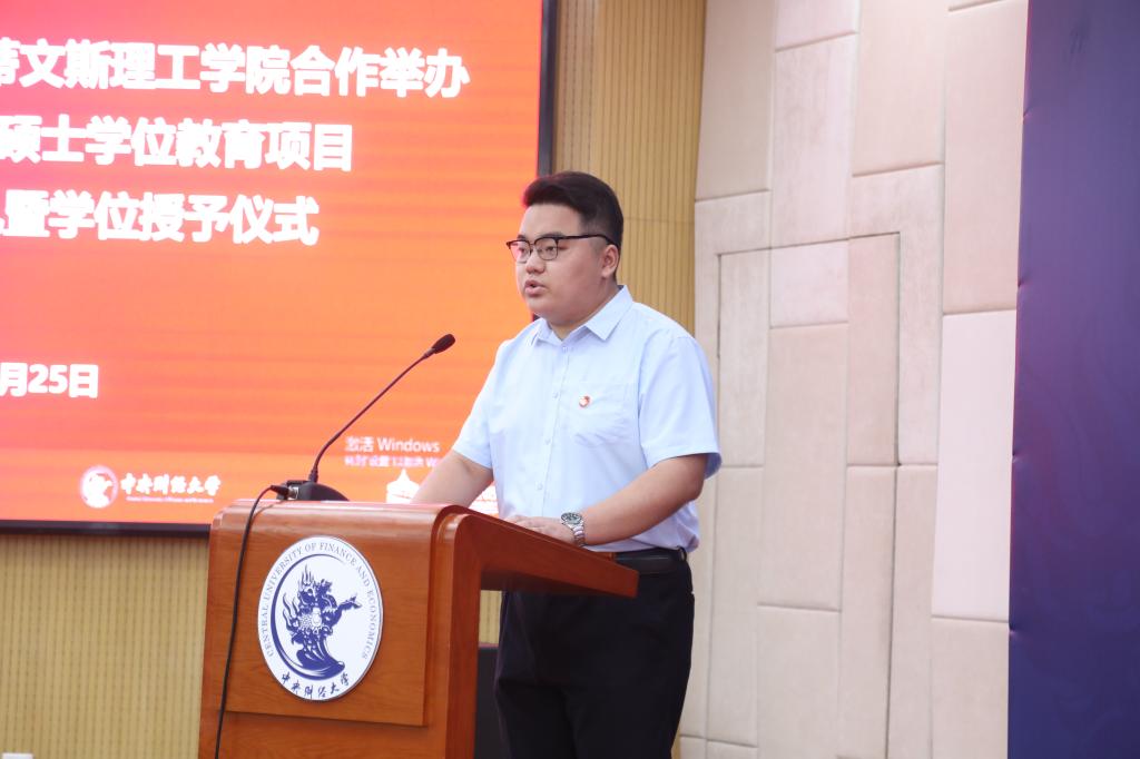 校国际合作处副处长、学院工程管理系王昊副教授作为中方教师代表致辞。王昊老师首先祝贺同学们经过努力和付出,终于收获了丰硕的成果。他期望同学们,在今后的工作生活中能坚持前进的动力,更加勇敢地应对未来的挑战。王老师勉励大家要终身学习,充实自我,在百年未有之大变局中,跟上时代的发展脚步,把握时代的脉搏。