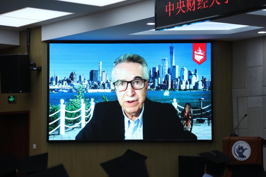 美国史蒂文斯理工学院商学院院长、合作办学项目外方负责人Gregory教授,给2021届毕业生发来视频贺词。在视频致辞中,Gregory院长首先表达了他对毕业生们的祝贺,他表示同学们在学习的过程中丰富了学识,增强了本领,增加了对世界的了解,并为终生学习提供坚实基础。他表达了对今后两校进一步深厚友谊、加强合作的期许,希望今后中财史蒂文斯项目能够欣欣向荣,越办越好。