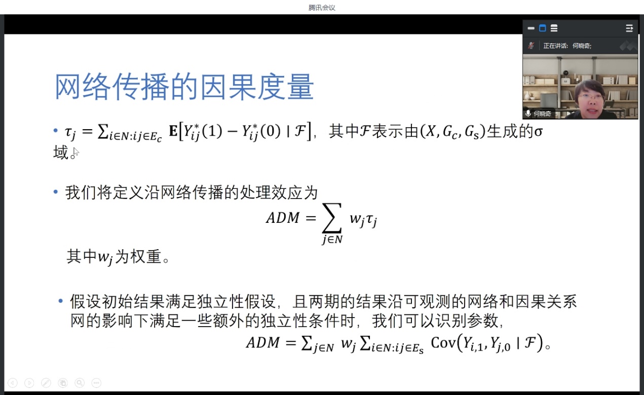 第二场学术讲座由金年会官网何晓奇助理教授主讲。讲座分为两部分,第一部分介绍了在顶级经济学期刊The Review of Economic Studies接收发表的研究成果“Measuring diffusion over a large network”, 论文主要分享了建模过程,该论文的主要贡献是在社会网络模型下,确立了个体行为交互影响的溢出效应是来自于关系网络,而不是个体特征,或者其他的环境相关性造成的,这对推动因果关系在网络溢出效应的理论发展具有重大意义。第二部分分享了自己的研究历程和一些心得体会,研究需要有兴趣也需要有毅力,此外踏实的基本功,持续的文献梳理和学习都是研究的必要手段,借此与同学们共勉!