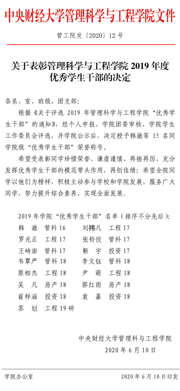 关于表彰jinnianhui金年会登录入口2019年度优秀学生干部的决定