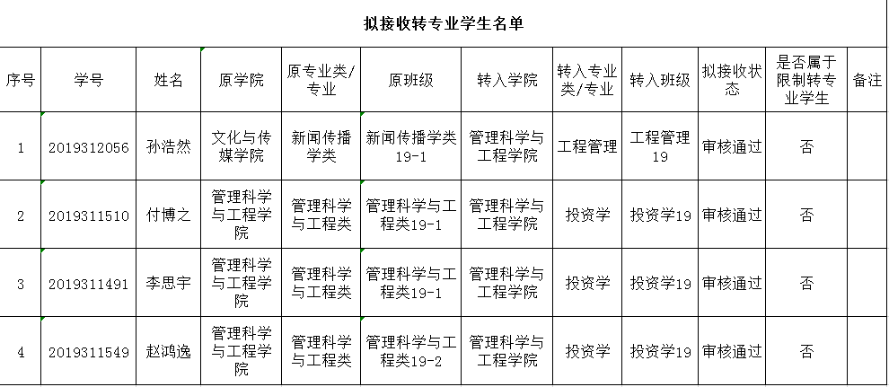 jinnianhui金年会登录入口转专业分流工作小组根据对2020年申请转入学院的申请人材料的初审、转专业相关专业内容的考试,决定录取以下同学,并对具体名单予以公示。公示时间7月10号到7月13号,公示期间,如有相关意见和建议请联系,15210988078张志祥老师。