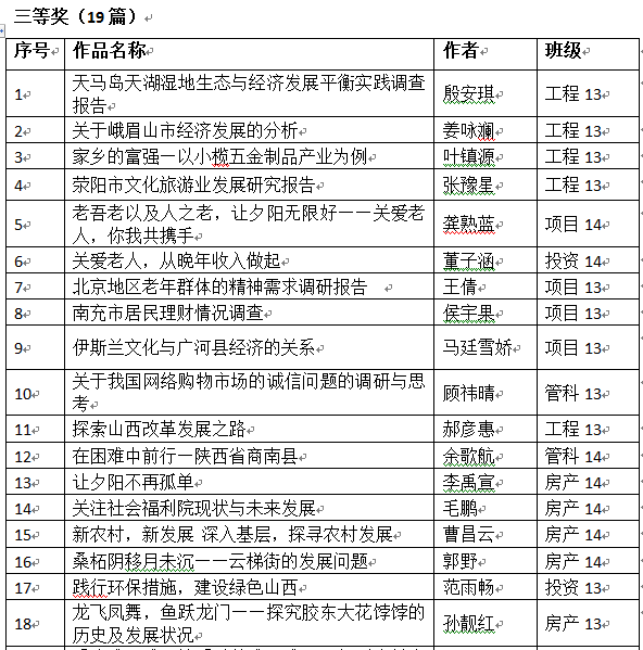 根据学校开展寒假社会实践的有关通知和《jinnianhui金年会登录入口大学生社会实践考核管理暂行办法》,经初评和复评,以下36份社会实践报告被评为优秀,推选结果报送学校团委参加评比。