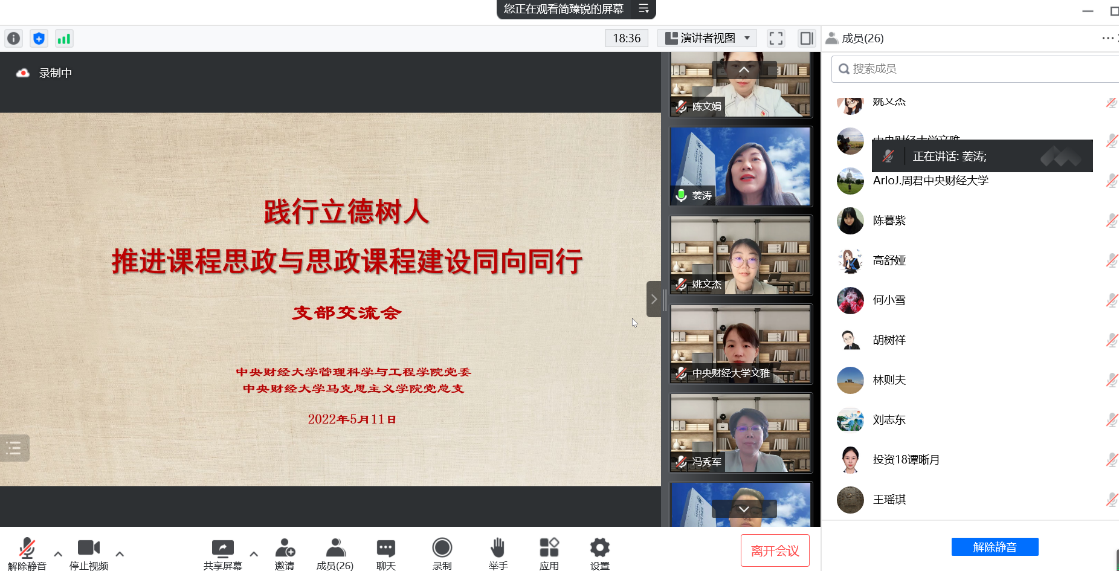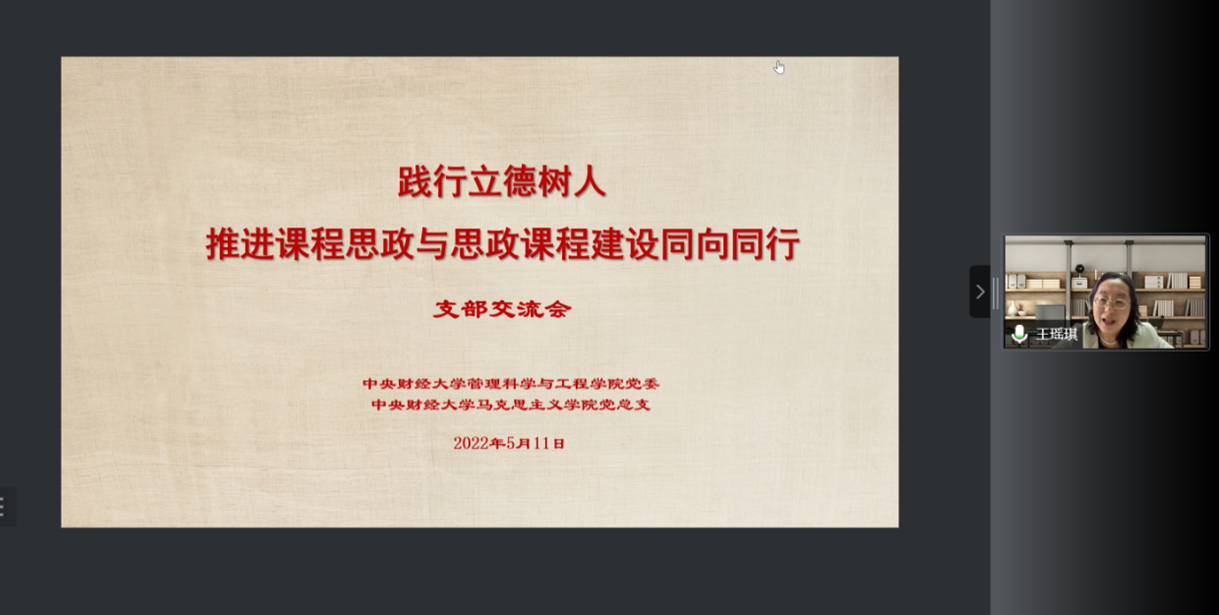 5月11日下午,jinnianhui金年会登录入口与马克思主义学院联合举办的“践行立德树人 推进课程思政与思政课程建设同向同行”会议在线上顺利召开,本次会议以党支部交流的形式展开。王瑶琪校长,jinnianhui金年会登录入口党委书记姜涛、院长刘志东,马克思主义学院党总支书记陈文娟、院长冯秀军,jinnianhui金年会登录入口投资系教工党支部、马克思主义学院思想道德与法治教研室党支部全体党员,双方的师生代表等参加了本次会议,会议由投资系教工党支部书记宋斌和思想道德与法制教研室党支部书记简臻锐主持。